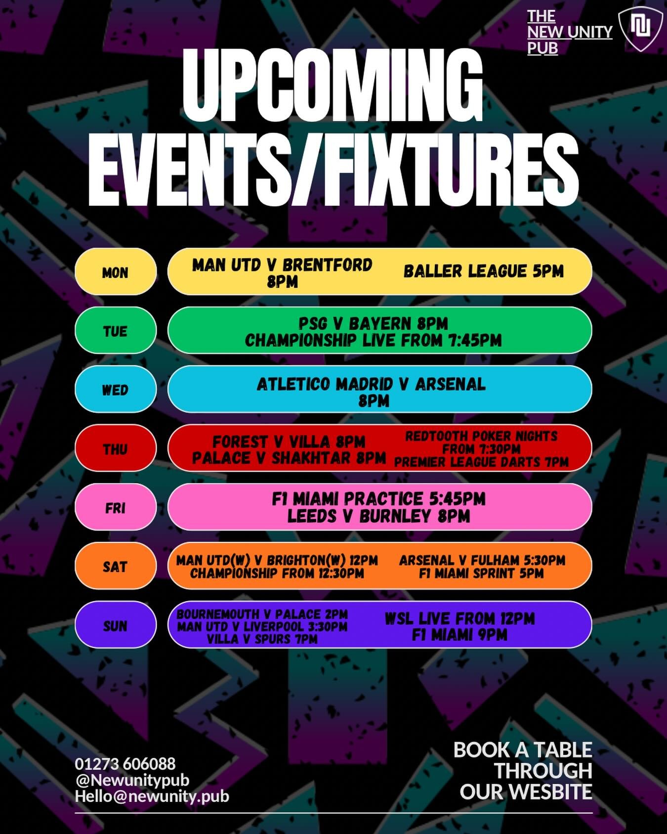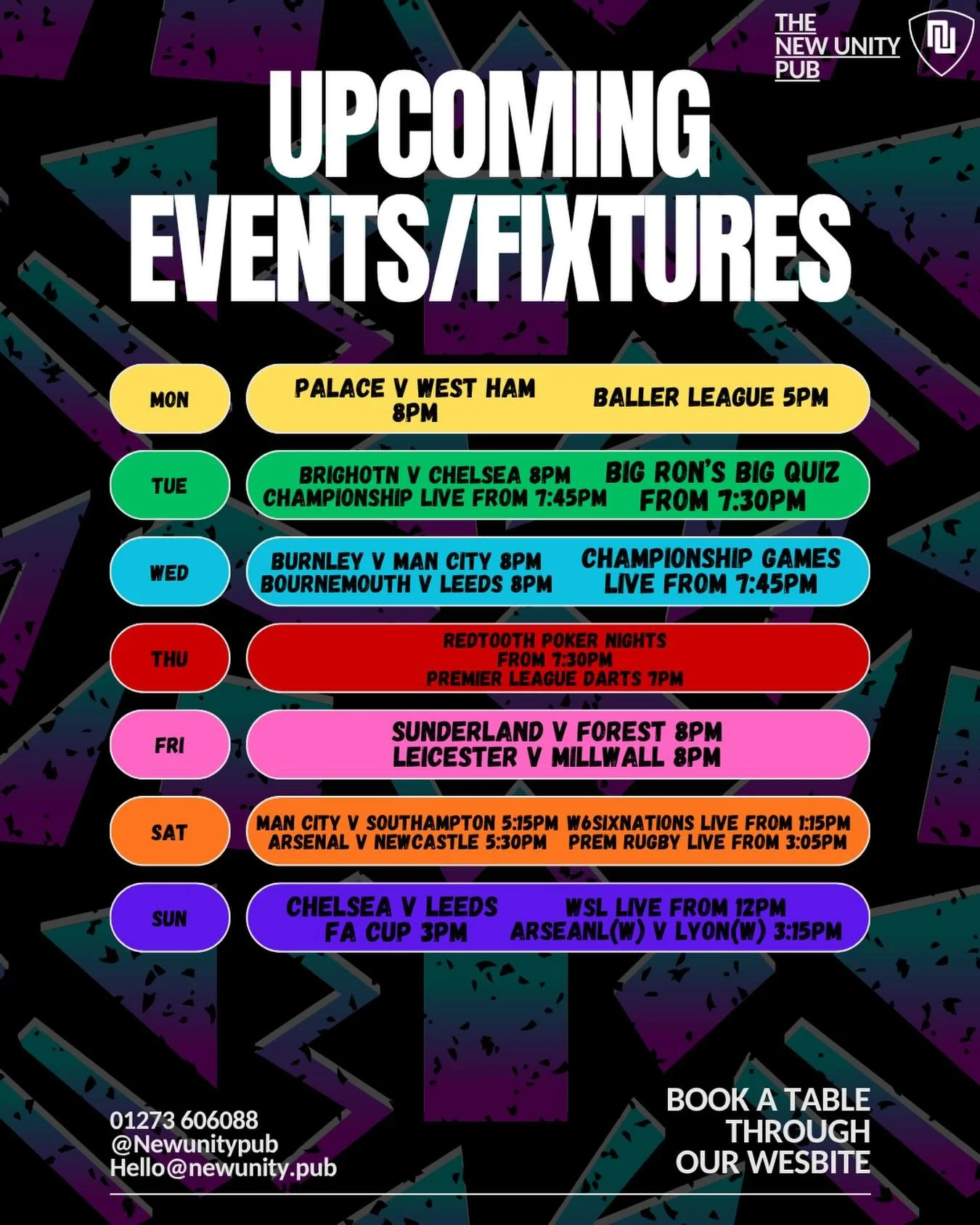 The new unity Brightons Best Sports Pub BOOK HERE BOOK HERE View fullsize View fullsize View fullsize View fullsize View fullsize View fullsize View fullsize View fullsize View fullsize View fullsize 15 tv screens and 2 projectors showing all the sport Upcoming Sport * Upcoming Sport * Upcoming Sport * Powered by FANZO
